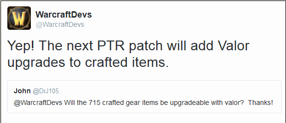 于是有玩家问了设计师WarcraftDevs专业制造装备可否用勇气点数升级,得到的答复是肯定的。