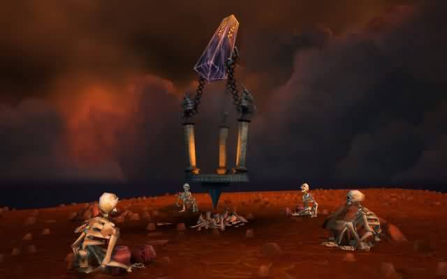 山上的神秘仪式:在破碎滩头的上方,有一个奇怪而神秘的遗址,它看起来像是一次失败的仪式地点,残留物似乎未曾被人破坏过。四个抱着坛子的骷髅坐在地上,中间有一根被锁着的柱子,锁链上饰有小的金属龙头,还有一个一个金光闪闪的盆在它下面不停旋转。没有 人知道他们的仪式是否成功,也不知道他们为什么死去。