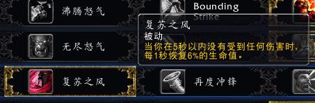 7.0的狂暴回复是2分钟CD,回复50%最大生命值,并且消耗掉激怒效果,点了沸腾怒气这个天赋1分钟一次回50%,并且不消耗激怒。