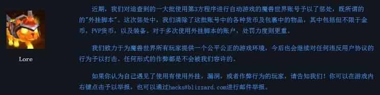 我们致力于为魔兽世界所有玩家提供一个公平公正的游戏环境,今后也会继续对任何违反用户协议的行为予以打击。任何形式的作弊都是不会被我们容许的。