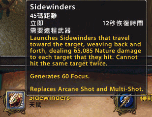 新增天赋技能响尾蛇射击:45码距离,12秒恢复时间 向目标发射一枚响尾蛇导弹,迂回前进,对每个击中的目标造成64085点自然伤害。不能集中同一个目标两次。 回复60点集中值。代替奥术射击和多重射击。