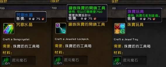 目前珠宝算是制造业完成度相对较高的专业,这次珠宝回归了传统的勘探矿石获得宝石的套路,但是和MOP一样挖取矿石的同时并不能获得宝石,只有通过珠宝设计20点技能学会的勘探来获取宝石。虽然也是20点珠宝就可以勘探,但是这次勘探不是100%出宝石,而是会出一种宝石碎片,除了7.0珠宝的初始任务要用到,似乎只能卖掉了。至于全部的勘探获取材料如下: