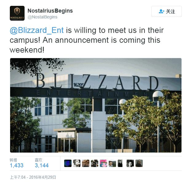 Mark在推特中以向Nostalrius团队祝贺的方式确认了此事,表示暴雪CEO麦克已经允许了,并将在接一下来的数周内为我们安排时间。