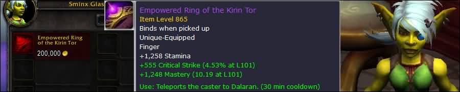 达拉然珠宝商店NPC出售的新版达拉然传送戒指:肯瑞托强化指环。