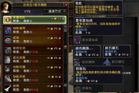 可以很明显得到看到军团急救取消了星级系统,不过依然是1级可学,直接800技能等级上限,初始1级可以学习2个军团新配方,然后在730,、740、770、780和800时可以学会其余的五种配方。而这所有的七种配方只用到四种材料: