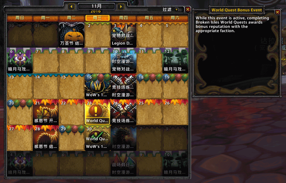 从游戏内日历可以看到,7.0新增了2个奖励活动:Legion地下城活动和世界任务奖励活动。