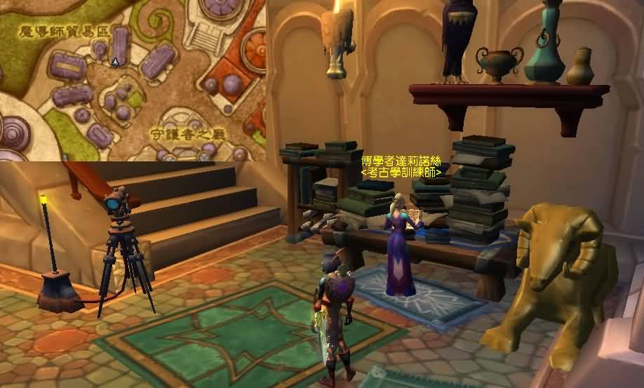 这里曾经是达拉然的挖矿训练师所在地,现在则是考古学训练师博学者达莉诺丝的考古小屋,进门向左望去,可以看到成山的考古书籍,和一些不同风格的瓶瓶罐罐,以及和狮身人面像一样动作的一只黄金绵羊,楼梯口旁则是考古家们常用的勘探工具。