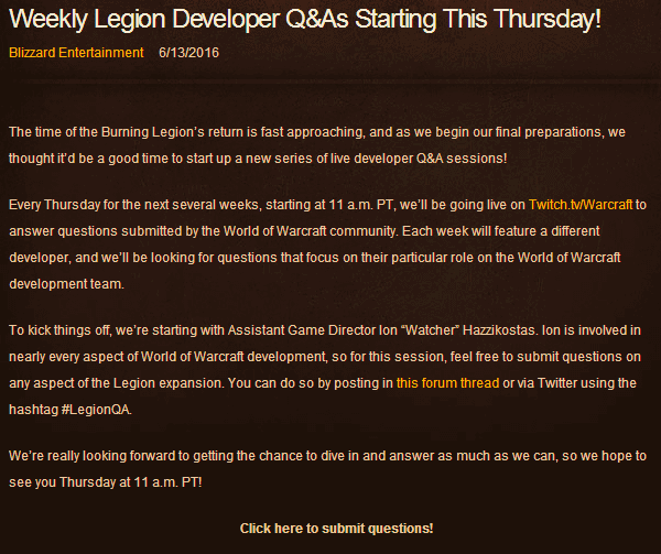 随着军团的再临脚步的一步步接近,我们也进入了最后的准备阶段,我们认为这个时候开一轮实时开发师问答是个不错的时间!