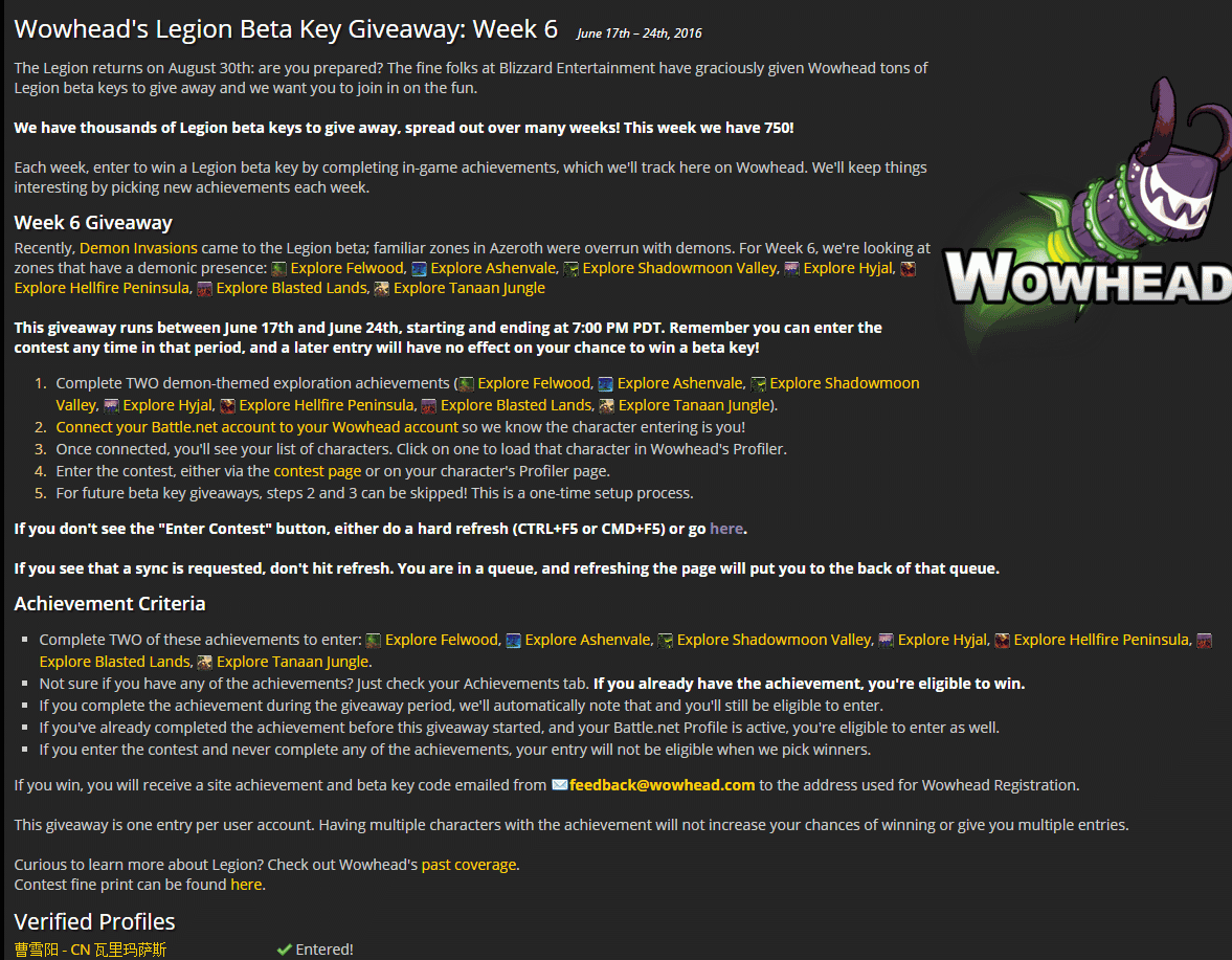 窝窝头第六周任务已经开启,依旧是750个激活码,时间是17日到24日(北京时间到25日哦),本次要求的成就具体如下: 探索费伍德森林, 探索灰谷, 探索影月谷, 探索海加尔, 探索地狱火半岛, 探索诅咒之地, 探索塔纳安丛林,其中探索影月谷指的是TBC那个,而且本周不再是要求两个成就而是以上所有,其他具体要求太简单就不重述了,大家继续去做分母吧,反正就剩不到两个半月了。。。。。。。。。