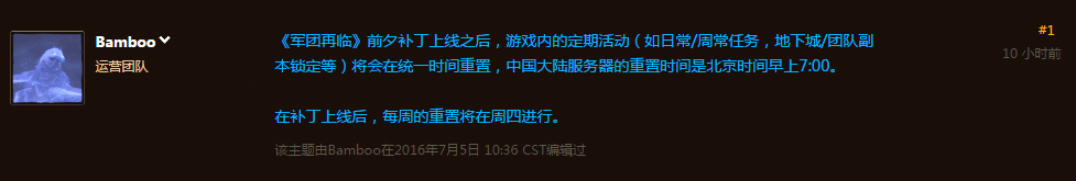 今天魔兽世界国服官网贴出了一则公告,表示在《军团再临》前夕补丁上线后,每周的CD重置时间将会进行调整。