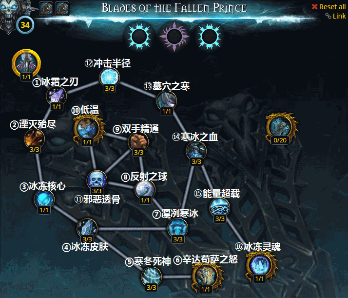 个人推荐神器加点路线:冰霜之刃-湮灭殆尽-冰冻核心-冰冻皮肤-寒冬死神-辛达苟萨之怒-凛冽寒冰-反射之球-双手精通-低温-邪恶透骨-冲击半径-墓穴之寒-寒冰之血-能量超载-冰冻灵魂