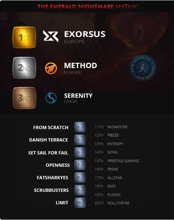最后是通关统计,前20的通关队伍里,其中欧服英语区8个,欧服俄语区3个,欧服法语区1个,欧服德语区1个,美服2个,澳服1个,国服1个。