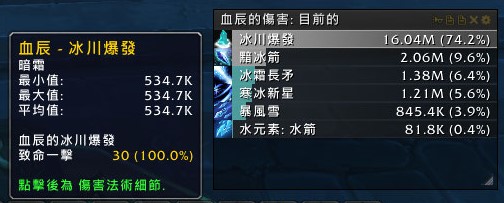 ●强项:冰霜射线基本上是这版本秒伤最高的单体技能,叠满10层后1跳爆击破百万,短时间战斗单体爆发超强。要把冰霜射线发挥到最强,必须有几个特定条件来配合:首先要起手嗜血的战斗,这样才能配合橙戒达到单场2~3次的嗜血,并且每次都有全程覆盖到冰霜射线,再来最好有手动爆发的饰品可以配合射线,像是紫罗兰堡的虚空石碑就是很好的选择。最后就是法阵,10秒完美覆盖冰霜射线50%增伤。